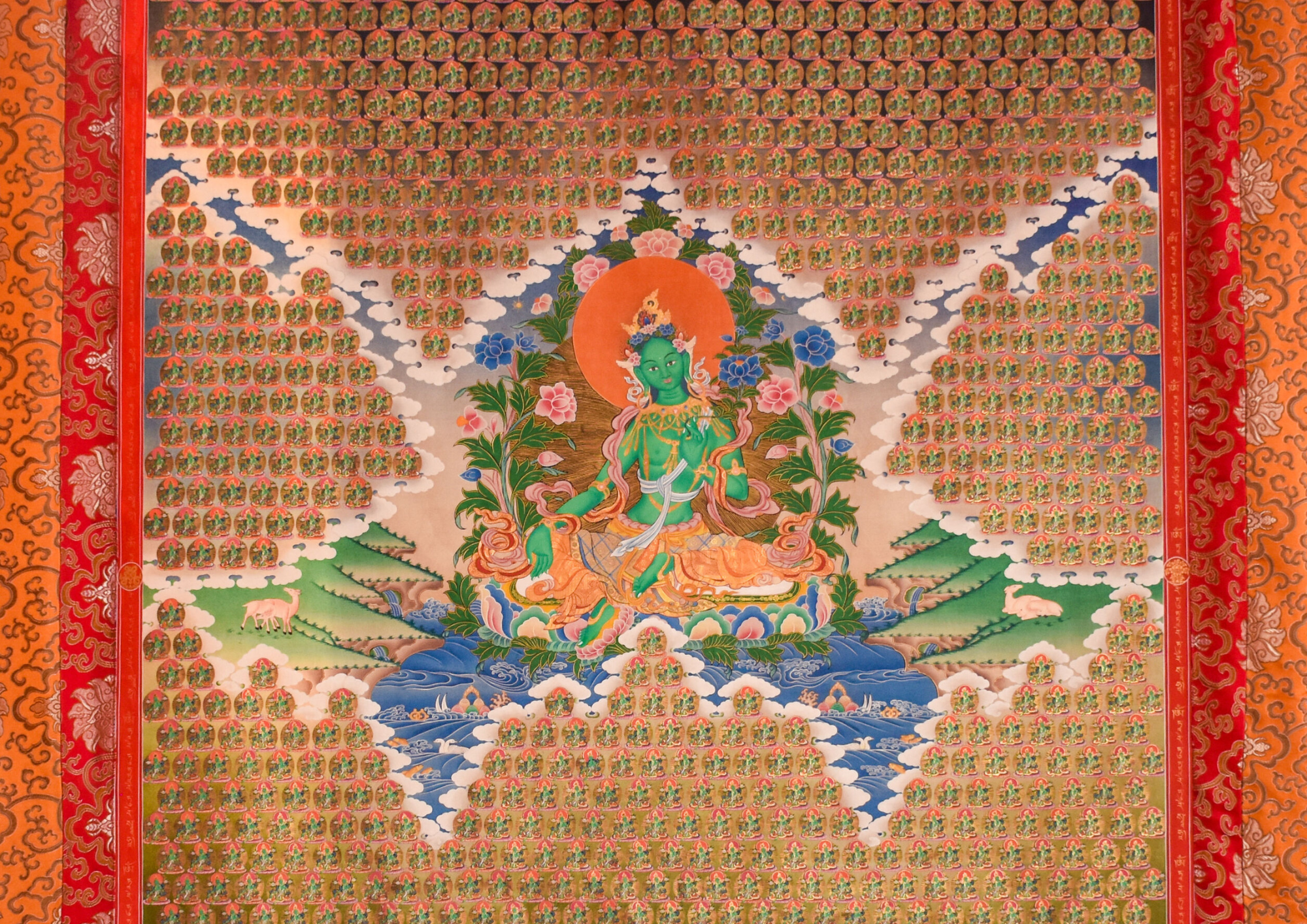 Tara Thangka sponsorship establishes a profound link with the Tara Temple and the compelling, exquisite energy embodied in a unique thangka adorned with 1,000 hand painted Green Taras. Your sponsorship of one of these Taras supports the Trikaya Tara Temple restoration, Tara Mandala operations and essential projects. Dedicate a Tara in honor of a loved one, a vast aspiration, for a challenging situation, or all sentient beings.