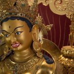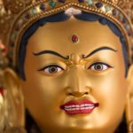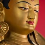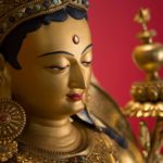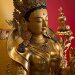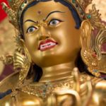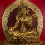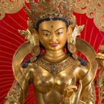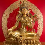 RIGJÉ LHAMO is semi-wrathful and red in color. The mantra TUTTARE blazes with rainbow light. Its sound magnetizes and conquers through the power arising from the union of emptiness and compassion. Upon her utpala flower is a bow and arrow poised to shoot sharp rays of light that destroy arrogant pride. She effortlessly accomplishes the four enlightened actions: pacifying, enriching, magnetizing, and subduing.