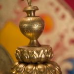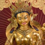 TSUGTOR NAMGYALMA is peaceful and golden yellow in color. She emanates from the crown chakra of the Buddha as Prajnaparamita. She is victorious over all non-virtue and afflictive emotions. Upon her utpala flower is a vase of immortality that radiates light in the ten directions. This light transforms the radiant essence of samsara and nirvana into nectar that fills her vase.