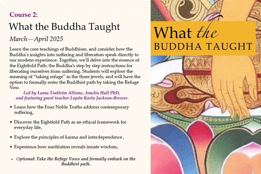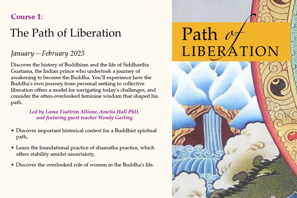 Led by Lama Tsultrim Allione, Dorje Lopön Chandra Easton, Dorje Lopön Charlotte Rotterdam, Tulku Ösel Dorje, Lopön Karla Jackson and a team of expert guest teachers, you’ll discover the history, core teachings and practices of Buddhism in an accessible yet immersive format.