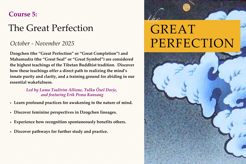 Culminating in the teachings of Dzogchen and Mahamudra, each course offers foundational teachings and specific practices related to each vehicle, featuring the wisdom of guest teachers from across Buddhist lineages.
