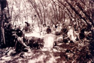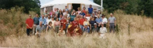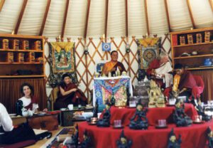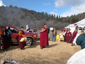The first group retreat is held with an outdoor kitchen and a 30’ yurt. Tsoknyi Rinpoche taught in the secret grove.