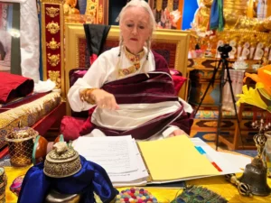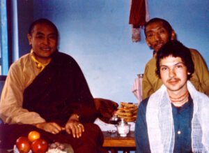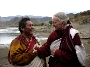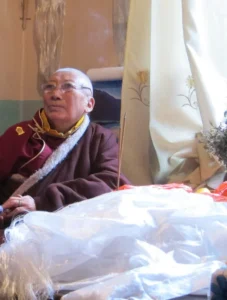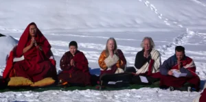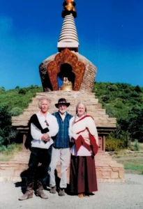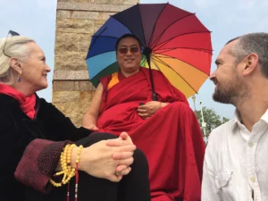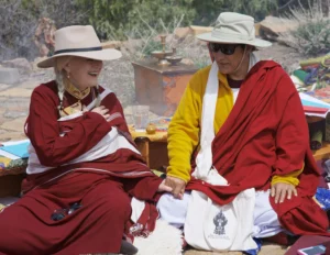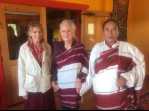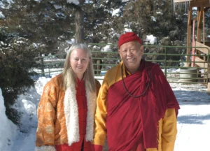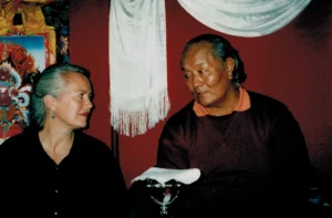 Lama Tsultrim makes a pilgrimage to Tibet. While there, she is recognized as an emanation of Machig Labdrön by the resident Lama of Zangri Khangmar (Machig’s monastery in Tibet). Before Lama Tsultrim’s arrival, he dreamed of a white Dakini coming from the West loudly sounding a damaru (drum used in Chöd). Additional indicative signs during the visit included rainbows lasting for hours and rain after a long drought.