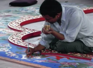 Lama Gyurme Rabgye and his brother Palden carve the columns and paint the lintels on the Tara Shrine. The shrine is built on the ridge called the ‘Charnel Grounds,’ just below Ekajati Peak. where A’dzom Rinpoche saw Tara’s right knee in his vision two years earlier. The work is completed by Palden.