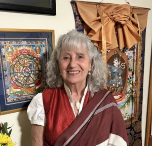 She meets Lama Tsultrim Allione in 1991 and subsequently goes on pilgrimage with her to several power places around the world learning Dakini and Chöd practices. Robin assists Lama Tsultrim in numerous retreats over the last 33 years. She recently completes the 10-year Gateway Program: Dzinpa Rangdröl (Self Liberation of Clinging). Robin also helped found the Bay Area Tara Mandala Sangha in 1992.