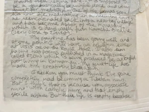 Lama Tsultrim has a vision, the first of many, of creating a Western retreat center where meditation could be practiced as it had been in Tibet. The center would be a place where visitors could explore the interface between Western psychology and Buddhism. She shares the vision with her mother during her visit to Nepal and writes a letter to her aunt explaining the vision.