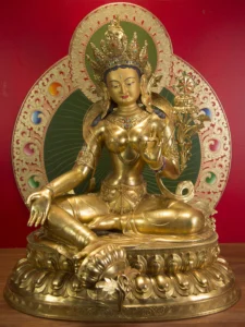 The 21 Taras embody essential attributes that are innately within each of us, including wisdom, compassion, strength, and the potential for liberation. Tara is commonly known as Arya Tara or Noble Tara in Sanskrit and Jetsun Drölma in Tibetan. She is seated on a full moon disc, her right leg extended – ready to liberate beings from suffering and protect them from fear. Tara increases the awakened heart of Bodhicitta and removes obstacles. The emanations are depicted as peaceful, semi-wrathful, and fierce. Her right leg is extended slightly, ready to step down to help beings in samara; the left leg is close to her body, symbolizing resting in nirvana. Her left hand is in the mudra of the Three Jewels at her heart and holds the stem of the Utpala flower, a blue lotus, resting above her left shoulder holding her symbol, such as a conch shell, golden fish, parasol, and wheel of dharma. Her right hand is resting on her right knee with an open, upward-facing palm – the mudra of Supreme Generosity. Each Tara has her own mantra.